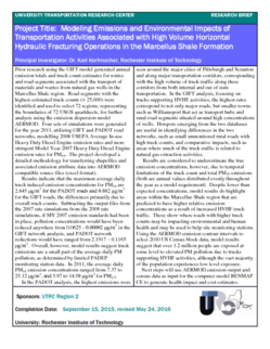 | Title: Modeling Emissions and Environmental Impacts of Transportation Activities Associated with High Volume Horizontal Hydraulic Fracturing Operations in the Marcellus Shale Formation Author(s): Dr. Karl Korfmacher Publication Year: 2016 Our initial UTRC research project identified routes and road segments with predicted high volumes of truck traffic related to natural gas extraction in the Marcellus Shale region. Results also generated annual estimates of pollution emissions per… |